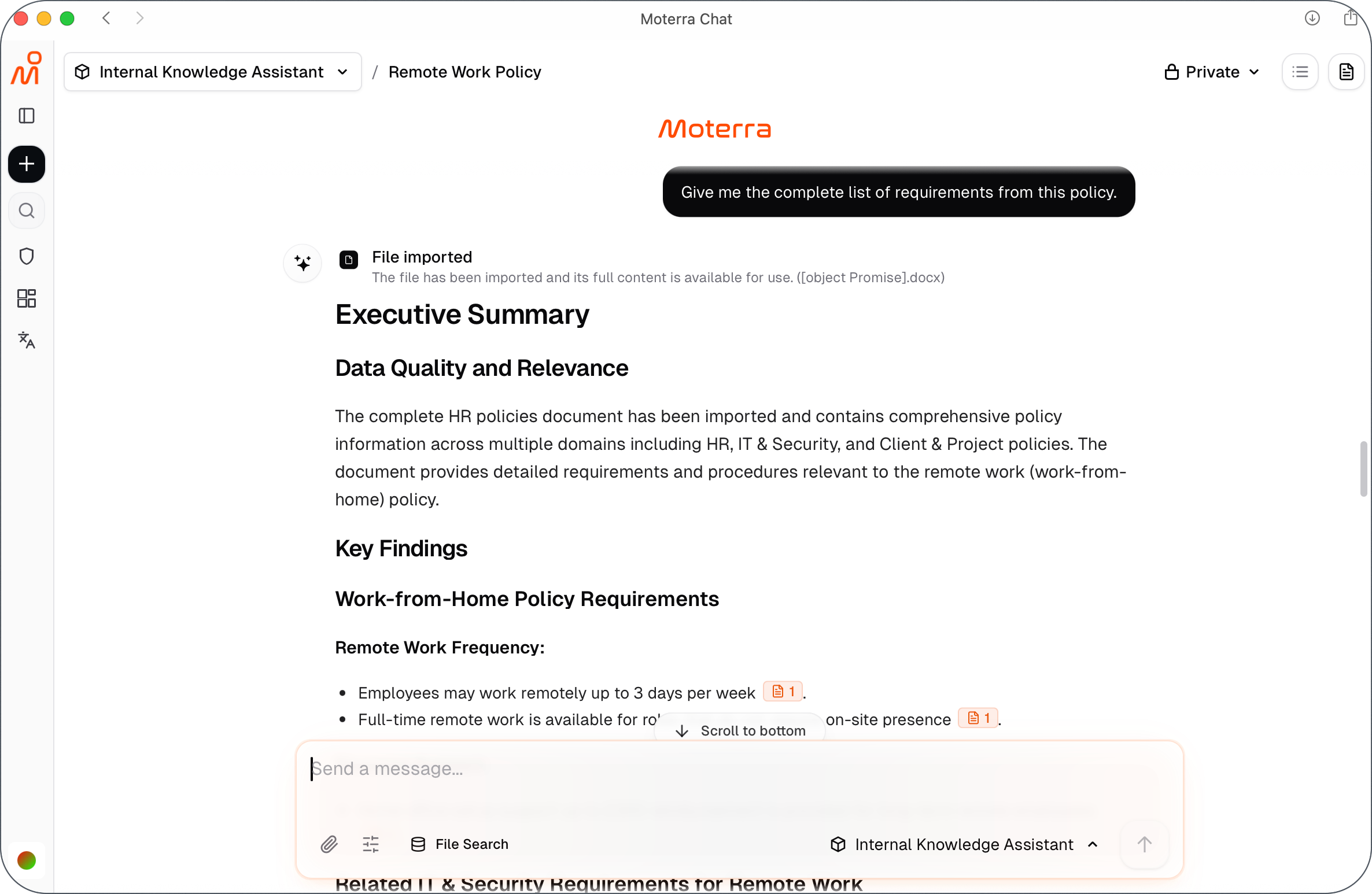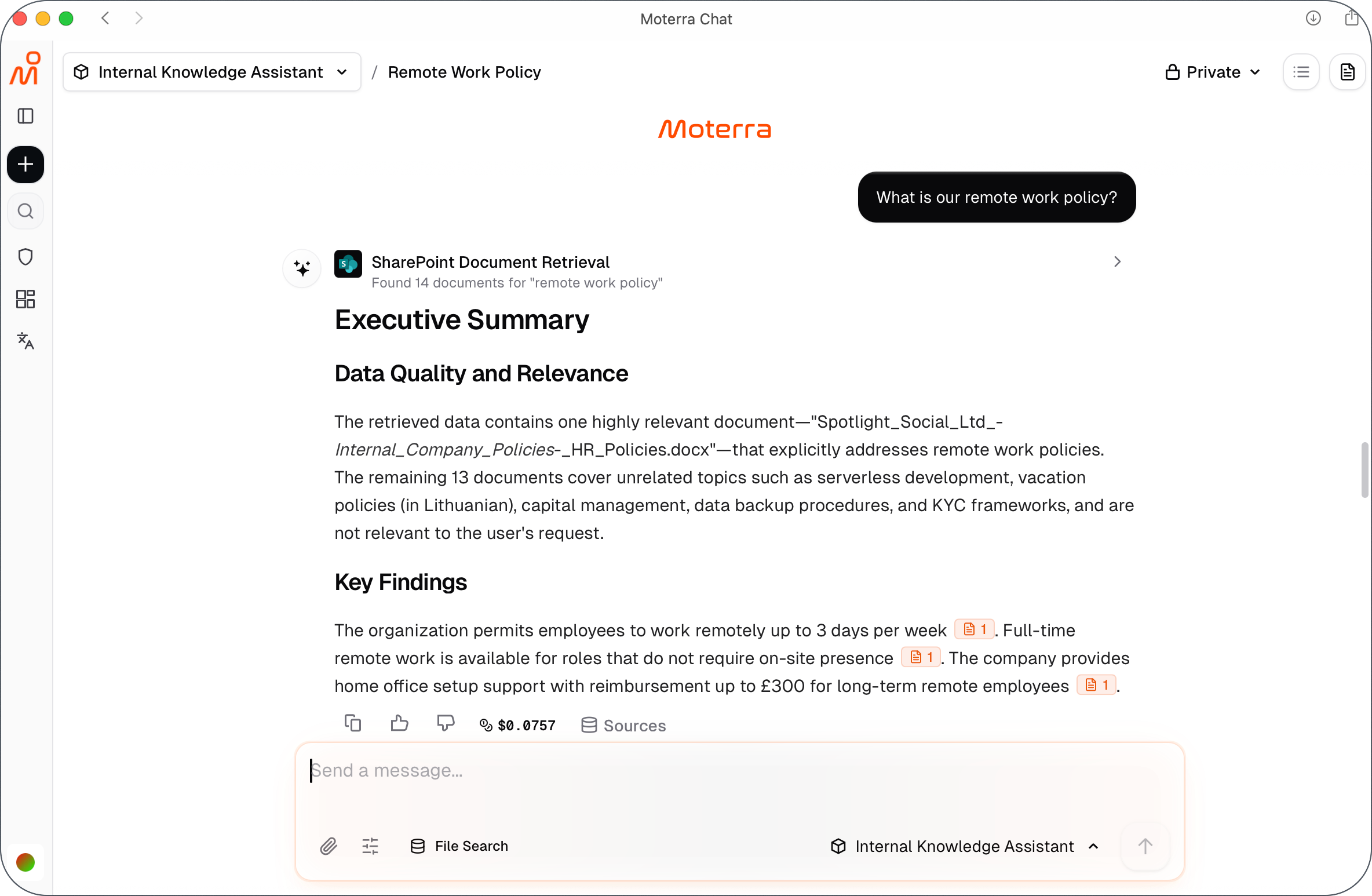 By default, the Internal Knowledge Assistant summarizes the most relevant information from your documents.