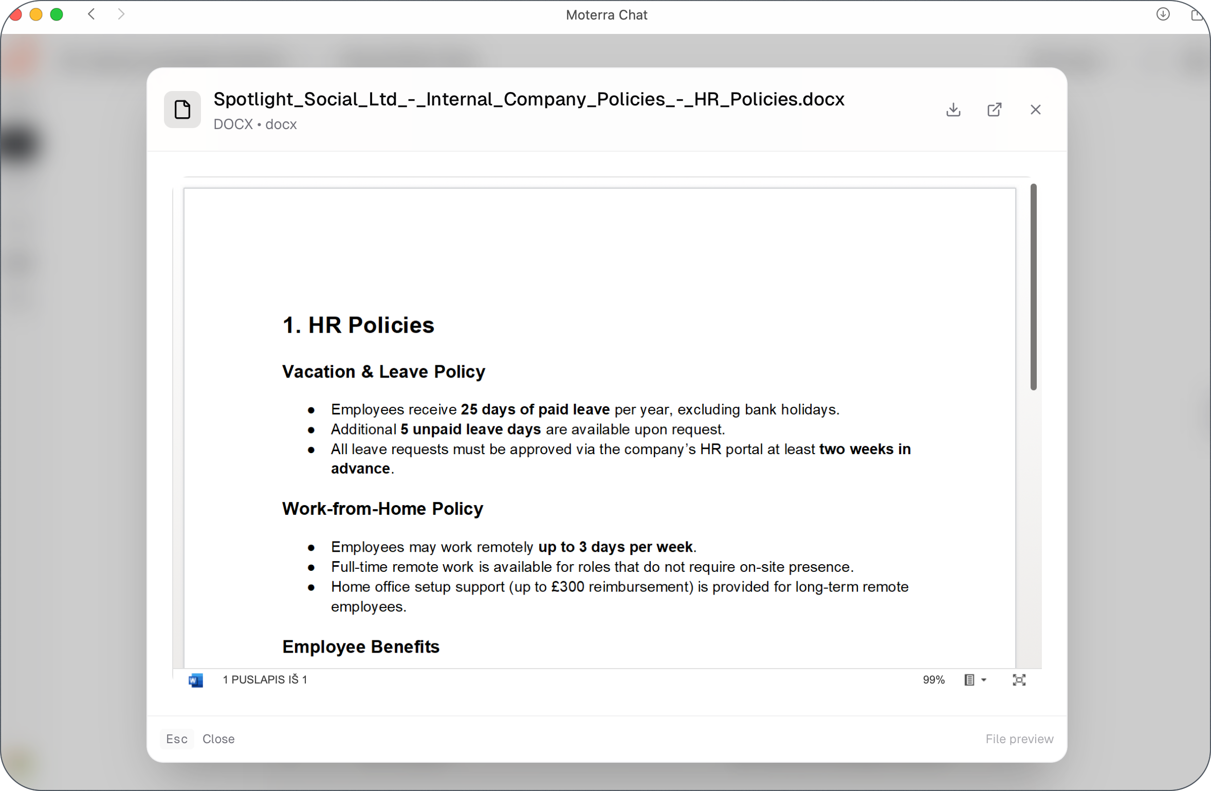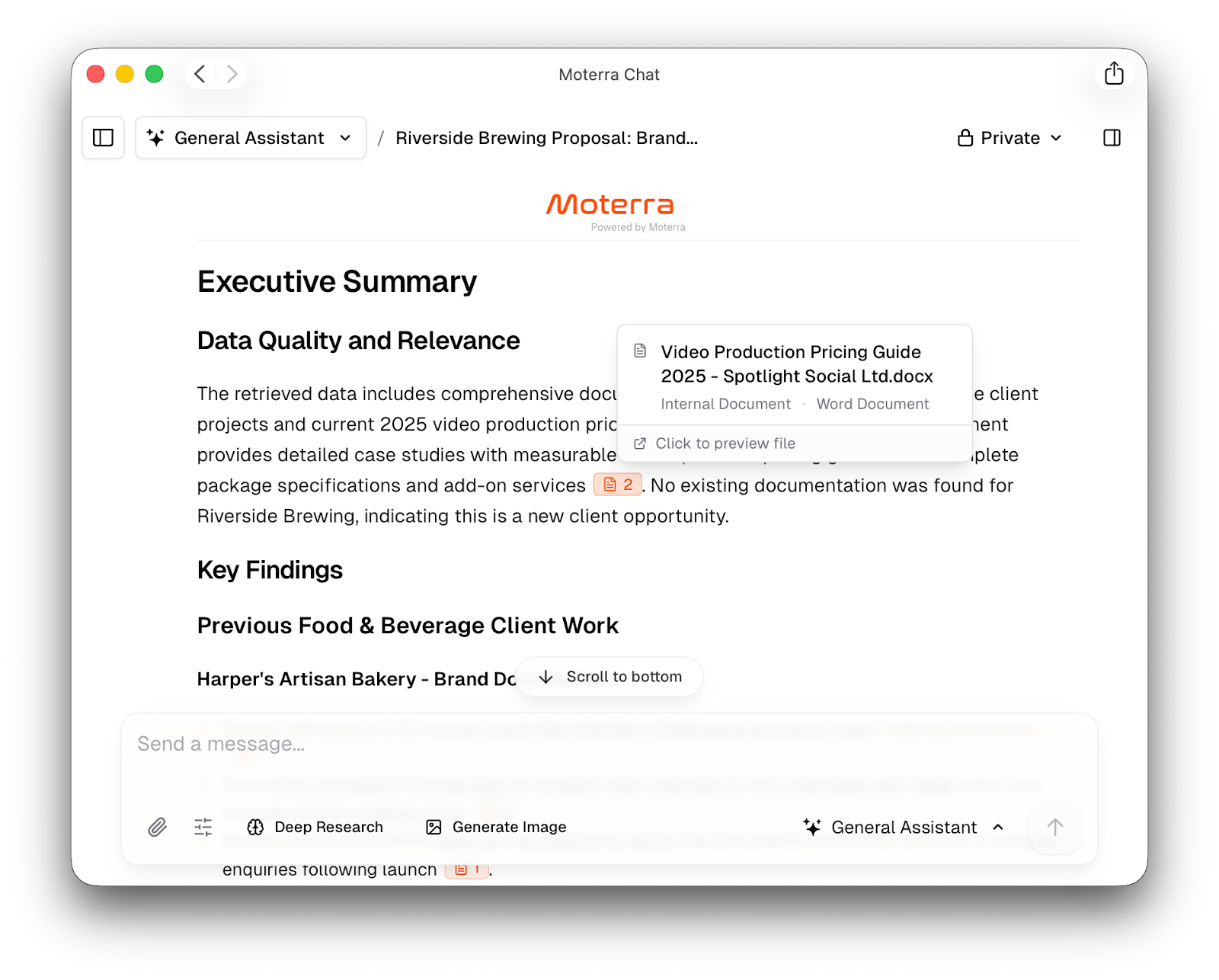 Opening a citation allows you to preview the document it was taken from. The preview does not always jump to the exact sentence or paragraph, but it provides direct access to the source file for verification.